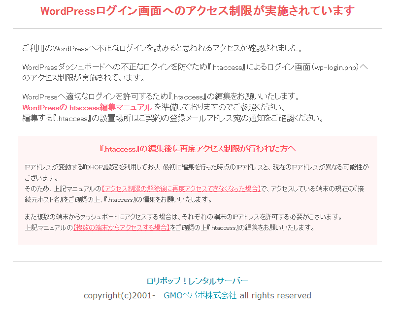ロリポップには検知・防御機能という機能があり、WordPressに対する総当たり攻撃や辞書攻撃を検知した場合にWordPressダッシュボードへのログインができないよう、ロリポップ側で『.htaccess』によるログインページ(wp-login.php)へのアクセス制限を実施しているそうです。
