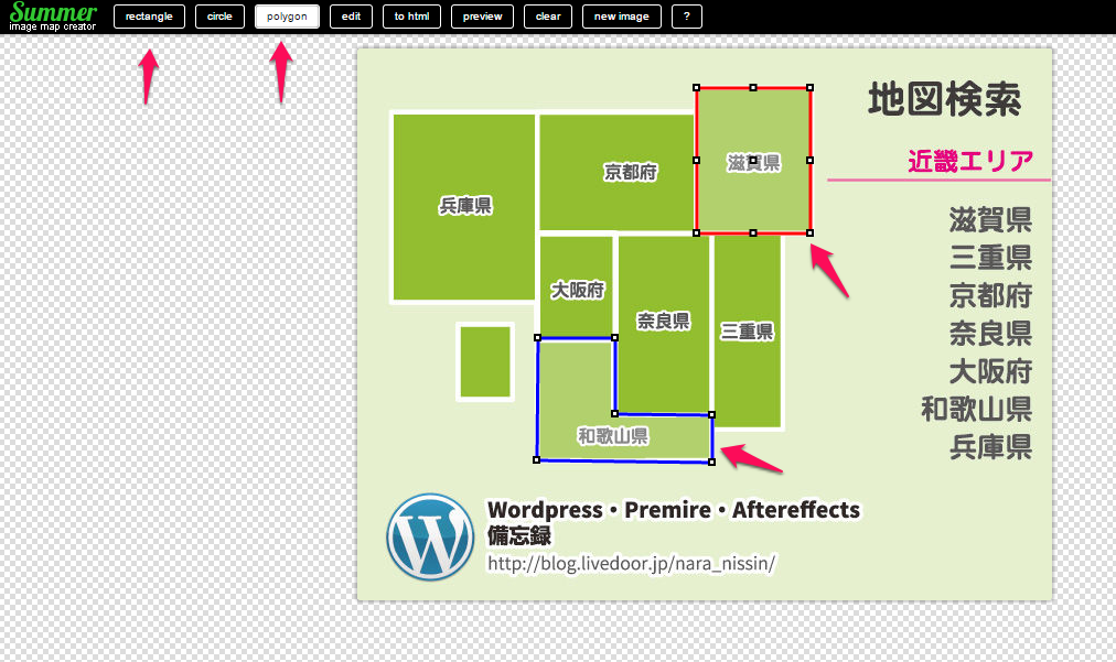 イメージマップという画像の座標を指定して作成するのですが、これまた簡単に作れるジェネレーターを見つけたのでブログに記します。